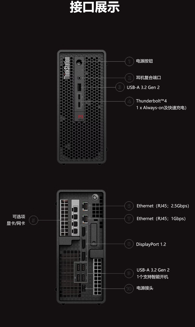 | 端口包含 | 正面 2 个 Thunderbolt™ 4 1 个 USB-A(USB 10Gbps/USB 3.2 Gen 2) 1 个耳机/麦克风组合插孔(3.5 毫米) | |